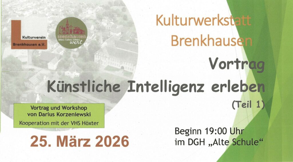Neugierig auf neue Technologien? Die Kulturwerkstatt Brenkhausen lädt alle KI-Interessieren zu einem spannenden Abend in das Dorfgemeinschaftshaus „Alte Schule“ ein. Am Mittwoch, den 25.03.2026 um 19.00 Uhr gibt es einen Vortrag mit praktischem Workshop zum Thema „Künstliche Intelligenz erleben“. In zwei Stunden entdecken Sie, wie KI den Alltag erleichtert – von Sprachassistenten bis zu cleveren Textvorschlägen.