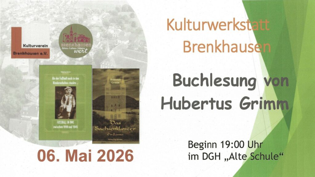 Am Mittwoch, 6. Mai 2026, von 19.00 bis 21.00 Uhr lädt die Kulturwerkstatt Brenkhausen zur Lesung aus dem historischen Roman „Das Sachsenkloster“ von Hubertus Grimm ins Dorfgemeinschaftshaus „Alte Schule“ ein.