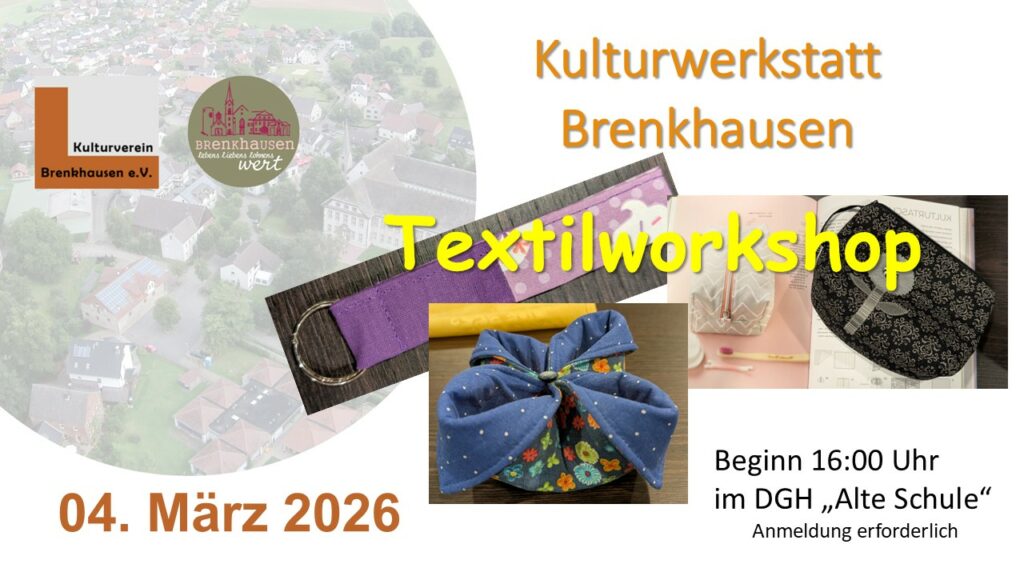 Die Kulturwerkstatt Brenkhausen lädt am 04.03.2026 zu einem kreativen Textilworkshop ins Dorfgemeinschaftshaus (DGH) „Alte Schule“ ein. Der Workshop findet von 16:00 bis 19:00 Uhr statt und richtet sich an alle Interessierten, die Spaß am Nähen, an der Textilgestaltung und am Upcycling haben. Teilnehmende nähen gemeinsam unter Anleitung praktische Täschchen, Eierwärmer, Körbchen, Schlüsselanhänger oder andere Upcycling-Gegenstände aus gebrauchten Stoffen und Kleidung.