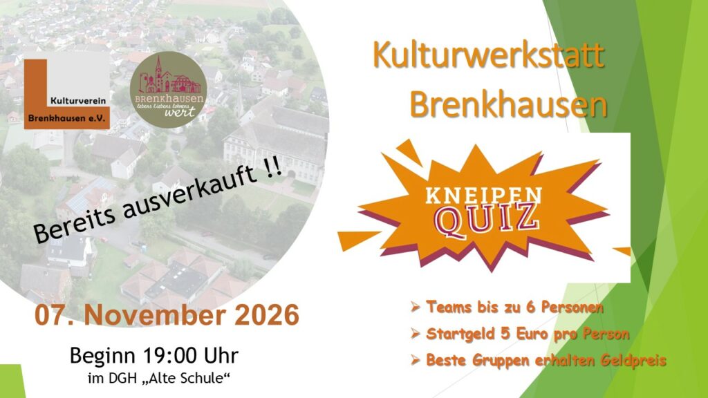 Die Kulturwerkstatt Brenkhausen veranstaltet das 2. Brenksche Kneipenquiz im DGH „Alte Schule“. Anmeldung sind leider nicht mehr möglich. Die Veranstaltung ist ausverkauft.
